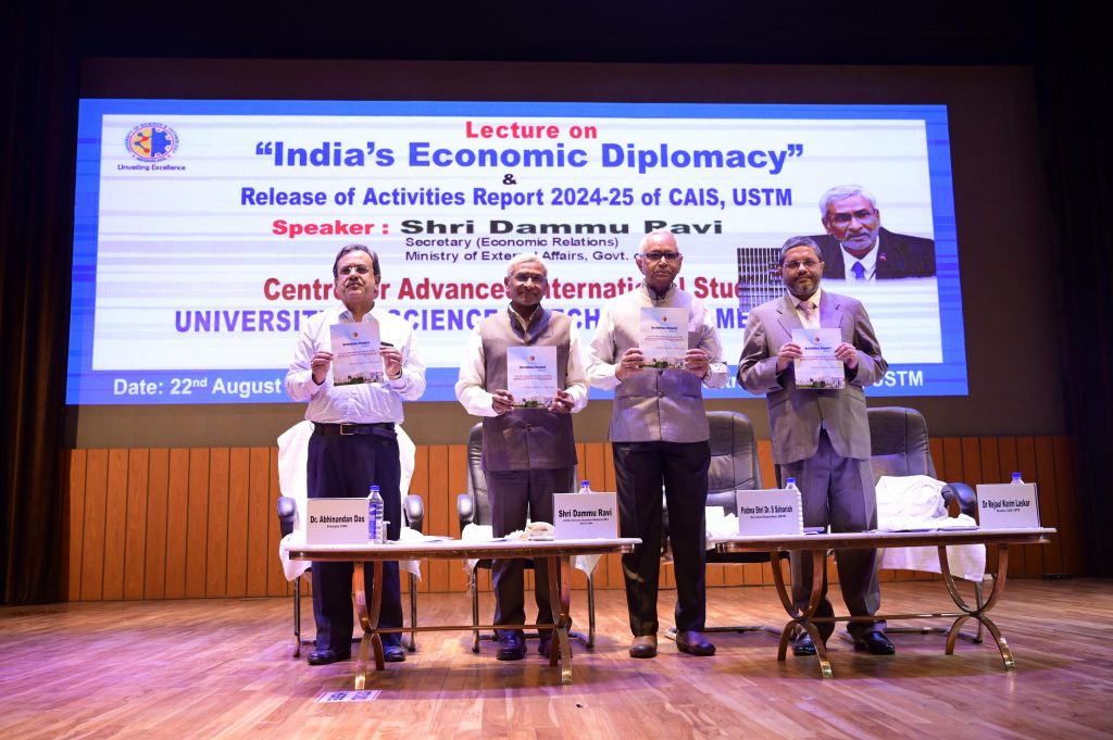 9th Mile, Khanapara, Ri Bhoi, Friday, August 22, 2025: The University of Science and Technology Meghalaya (USTM) hosted an outstanding lecture on “India’s Economic Diplomacy” by Shri Dammu Ravi, Secretary (Economic Relations) at the Ministry of External Affairs, Government of India. The occasion was chaired by Padma Shri Dr. Sarbeshwar Sahariya, Pro-Vice Chancellor of USTM.