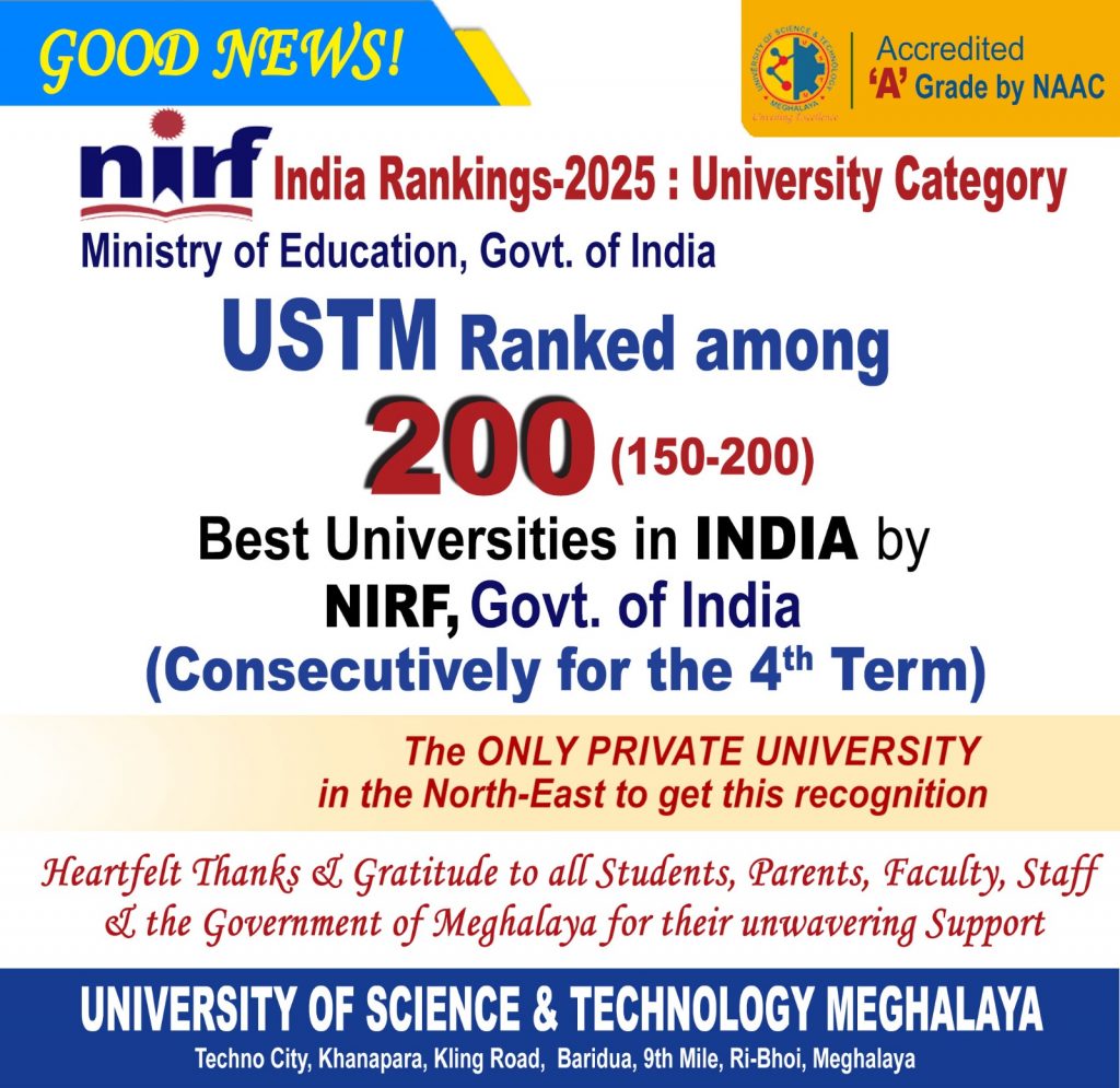 For the fourth consecutive year, USTM stands tall as the first and only private university in the North East to be ranked among India’s top 200 universities (151–200 band) by the National Institutional Ranking Framework (NIRF) 2025, Ministry of Education, Government of India.