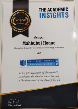 9th Mile, Khanapara, Ri Bhoi, Friday, October 31, 2025: The Academic Insights Magazine, a prominent Indian monthly publication, selected Shri Mahbubul Hoque, Honourable Chancellor of the University of Science and Technology Meghalaya (USTM), as India’s 25 most inspiring education leaders.